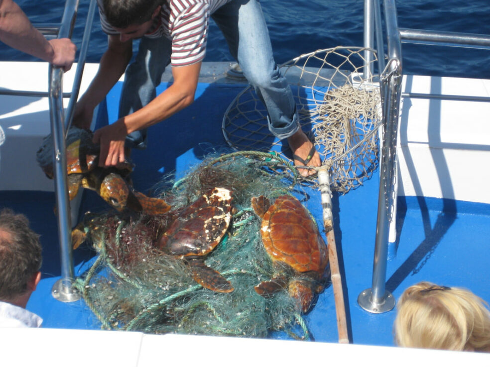 Las redes a la deriva, las bolsas de plástico, las anillas plásticas que unen las latas de bebidas y un montón de basura más que con frecuencia se torna en trampa mortal para la fauna marina.